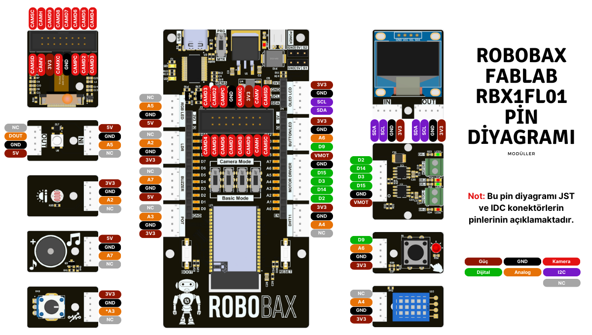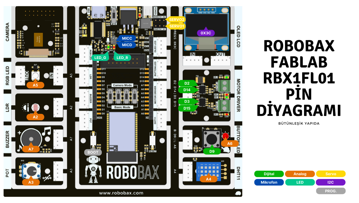 Robobax FabLab, bu tip mikro denetleyici kartların kusursuz bir örneğidir. Kart, kullanıcı dostu ve esnek bir platform sunmak üzere özel olarak tasarlanmıştır. Esp32 Wrover-E ana modülü üzerine inşa edilmiş çok yönlü bir elektronik geliştirme kartıdır. Güçlü çift çekirdekli 240 MHz Tensilica LX6 mikroişlemci, 520 KB SRAM, 448 KB ROM, 8 MB PSRAM ve 4 MB SPI Flash, bu kartın hızlı işlem yetenekleri ve geniş bellek kapasitesini beraberinde getirir. Ayrıca ADC, DAC, UART, PWM, I2C, SPI, I2S, SD/SDIO/MMC, Kapasitif Algılama, TWAI, RMT, JTAG, Timer, darbe sayıcı ve harici kesme gibi zengin çevresel bağlantı yelpazesine sahiptir. Bu mikroişlemci, yüksek performanslı işlemler ve karmaşık hesaplamalar için idealdir, bu sayede kullanıcılar gelişmiş robotik projeleri ve yoğun veri uygulamaları gerçekleştirebilirler.