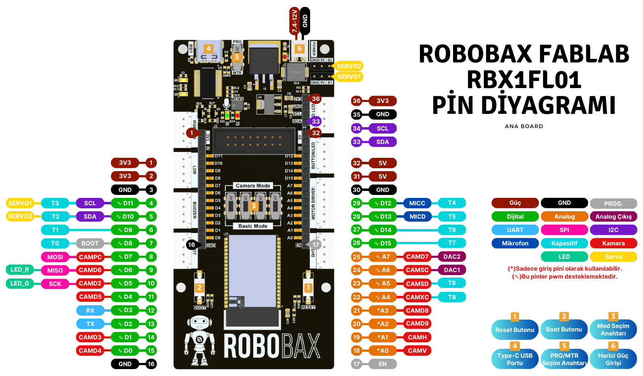 Robobax FabLab, bu tip mikro denetleyici kartların kusursuz bir örneğidir. Kart, kullanıcı dostu ve esnek bir platform sunmak üzere özel olarak tasarlanmıştır. Esp32 Wrover-E ana modülü üzerine inşa edilmiş çok yönlü bir elektronik geliştirme kartıdır. Güçlü çift çekirdekli 240 MHz Tensilica LX6 mikroişlemci, 520 KB SRAM, 448 KB ROM, 8 MB PSRAM ve 4 MB SPI Flash, bu kartın hızlı işlem yetenekleri ve geniş bellek kapasitesini beraberinde getirir. Ayrıca ADC, DAC, UART, PWM, I2C, SPI, I2S, SD/SDIO/MMC, Kapasitif Algılama, TWAI, RMT, JTAG, Timer, darbe sayıcı ve harici kesme gibi zengin çevresel bağlantı yelpazesine sahiptir. Bu mikroişlemci, yüksek performanslı işlemler ve karmaşık hesaplamalar için idealdir, bu sayede kullanıcılar gelişmiş robotik projeleri ve yoğun veri uygulamaları gerçekleştirebilirler.